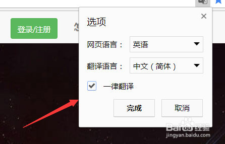 在弹出的翻译选项窗口中选择翻译的网页说话,这里默认选择的是英文,我们可以把英文换当作其他的说话,方针说话就选择简体中文即可。