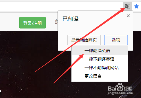 我们除了翻译英文网页之外,还可以翻译其他国度的说话,方式是点击翻译网页按钮,弹出菜单点击选项---更改说话。