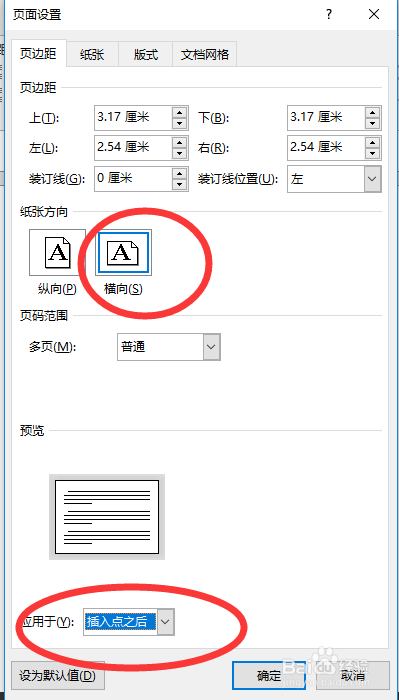 页面设置界面,设置纸张偏向为横标的目的,应用 插入点之后。