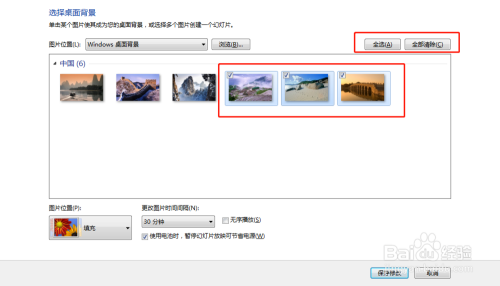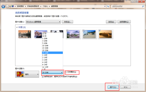 然后选择改换图片时候距离,默认30分钟,可以自行选择,若是勾选无序播放,图片将随机改换,按照上述步调选择好之后,编纂保留点窜,桌面布景就可以主动切换了。