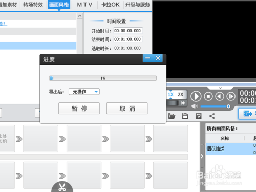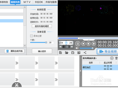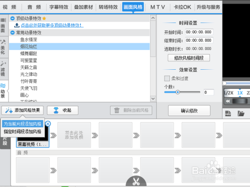 执行画面气概菜单,从动景中选择烟花光辉,并设置为当前片段添加气概。