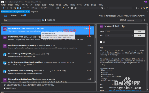 3. 在弹出【NuGet】的选项卡中-》【浏览】->搜刮http->【Mifrosoft.Net.Http】,点击安装