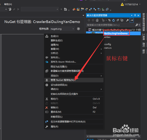 2. 选择您建立的解决方案,项目右键选择【办理NuGet法式包...】