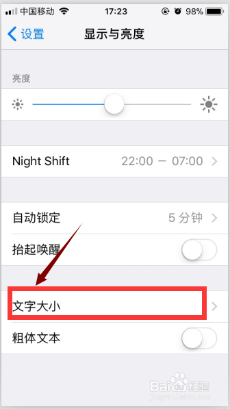 3、进入显示与亮度的界面后,在界面的靠下方的位置有个文字大小的选项,点击它。