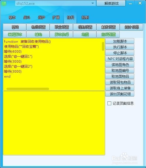 1.主动打怪(CTRL+G),加载剧本(用天逸挂机剧本生当作),执行剧本,遏制执行,NPC对话内容,读地图脚色,取地图编号,取地面物品,读取背包物品,读取身上装备。