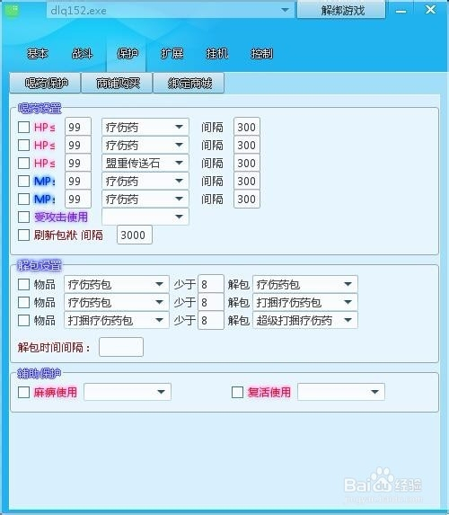 喝药设置:固定值、喝多瓶药、受进犯利用、刷新包裹。解包设置:物品、解包时候距离。辅助庇护:麻木利用(传送类物品)、新生利用(传送类物品)。