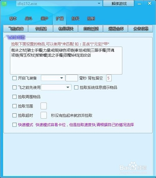 1、飞捡装备:好比您打斗时想捡取别人爆的圣战装备,您就添加圣战两个字就行了,或者法神,天尊,,勾上恍惚匹配与捡取四周物品就好了。