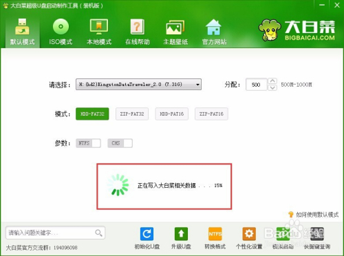 耐烦期待年夜白菜装机版u盘建造东西对u盘写入年夜白菜相关数据的过程。如下图所示