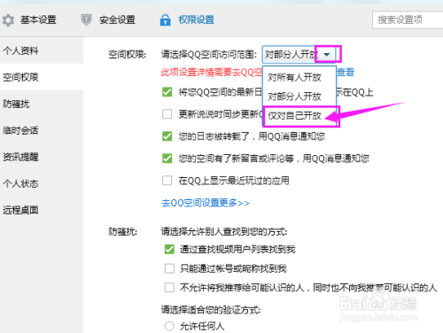 点击“请选择QQ空间权限旁的下拉按钮”,选择【仅对本身开放】。如许,就只有本身能看到本身的空间了,他人都将无法拜候。