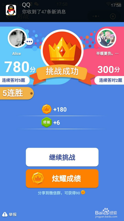 6、当作功乃掉败之母。当作功与否都来自我们的堆集和常识的矫捷运用·所以可以分享成果到微信群,即可继续博得金币奖励90。脑筋王者来挑战下一步继续。