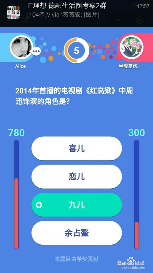 5、2014年首播的电视剧《红高粱》中周迅扮演的脚色是?准确谜底:九儿。