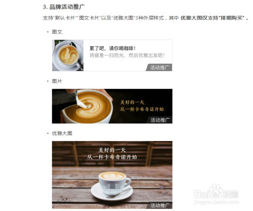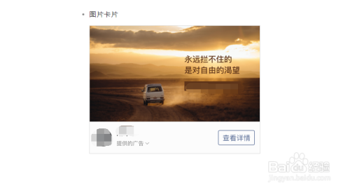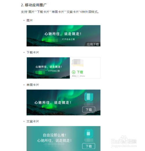 公家号告白中的底部告白本家儿要可以推广5种工具的推广:1. 公家号的推广(存眷卡片形式、图片卡片形式);2.移动应用的推广(图片形式、下载卡片形式、单图卡片形式、案牍卡片形式);3.品牌活动的推广(默认卡片形式、图文卡片形式、优雅年夜图形式,此中优雅年夜图需要排期采办);4.微信卡券的推广(一些优惠券的推广,点击后可以领取卡券,在微信里付出);5.电商商品的推广(落地在店肆)。