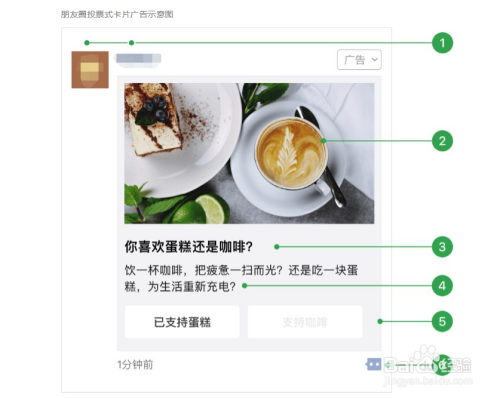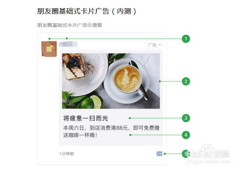 朋友圈图文告白的内容需要有(按照图片内编号别离是):1.告白本家儿头像和名称;2.外层案牍;3.图片;4.文字链;5.用户社交互动按钮。若是是当地商铺的话 ,还需要在图文告白中插手门店的标识。