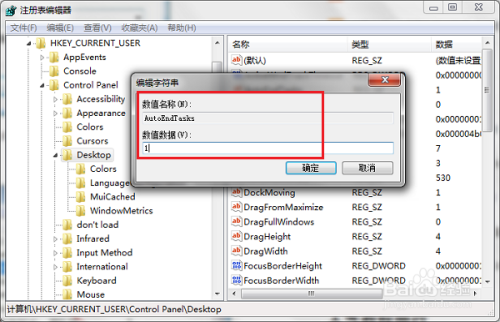 第五步进去AutoEndTasks编纂界面之后,设置值为1,点击确定,如下图所示: