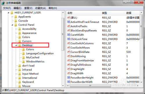 第三步在注册表编纂器中,依次点击HKEY_CURRENT_USER->ControlPanel->Desktop,如下图所示: